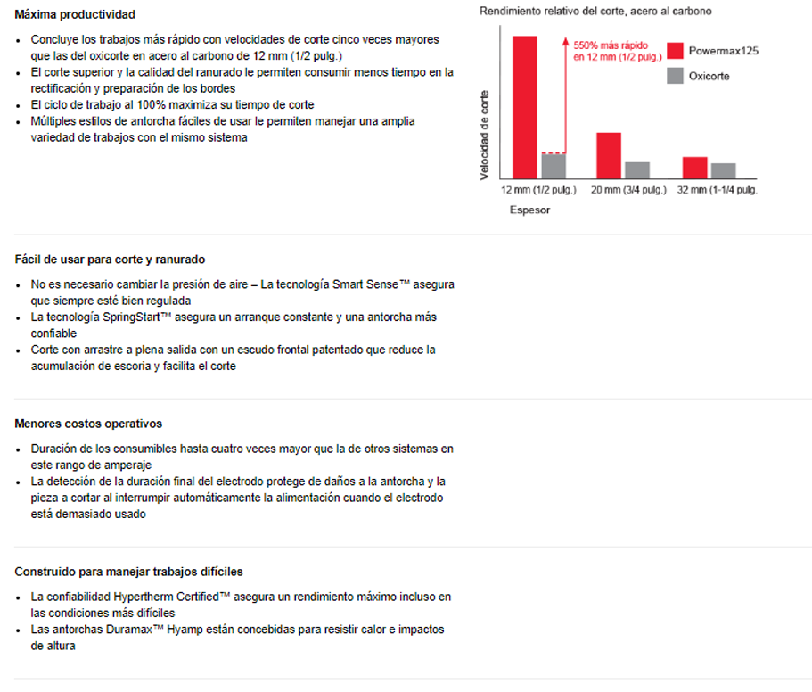 Proporcionando una potencia y rendimiento máximos para plasma aire, el sistema de plasma Powermax125® corta metales gruesos rápidamente. Capaz de hacer que los trabajos más difíciles de corte y ranurado resulten fáciles, el sistema ofrece un ciclo de trabajo al 100%, una capacidad de perforación de 1 mm (25 pulg.) y una rápida remoción de metales por ranurado. También le ofrece lo último en innovaciones tecnológicas, como la tecnología Smart Sense™ para ajustar automáticamente la presión de gas. Once estilos de antorcha Duramax® Hyamp™ dan versatilidad para corte manual, automático portátil y en mesas X-Y, así como corte a largo alcance y corte y ranurado robóticos.
